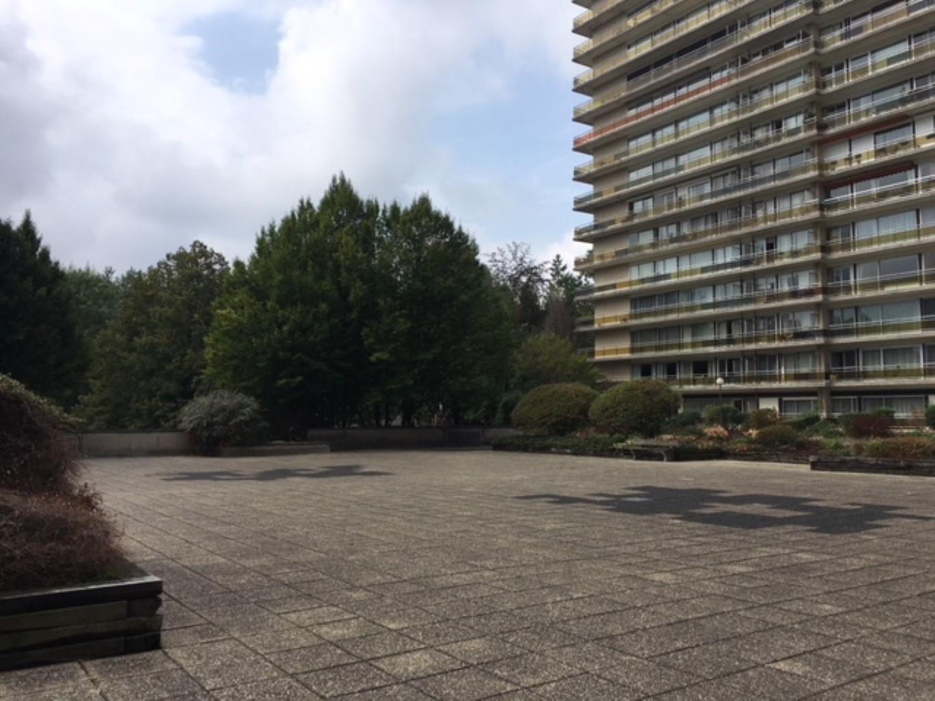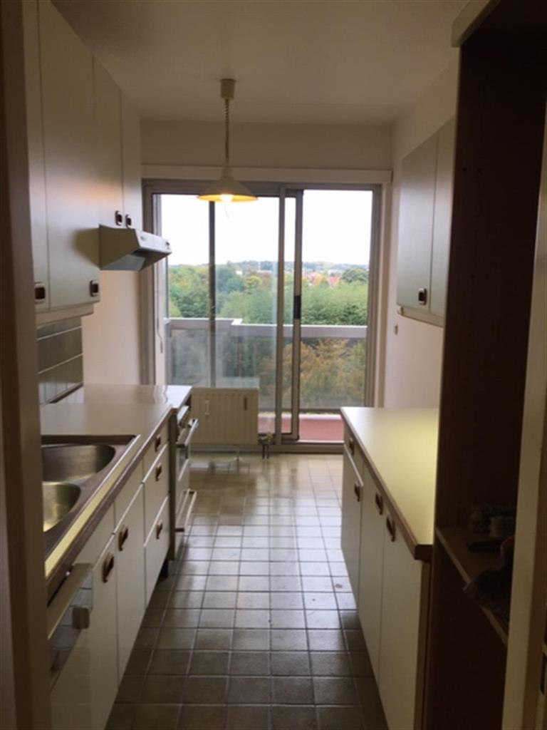 OPTION !! En attende de compromis, les visites sont donc suspendues, merci. Woluwe Saint Lambert, face au Shopping et à proximité du métro de Roodebeek, au septième étage sur 12 bel appartement à rafraîchir facilement composé de 95 m² + 2 grandes terrasses de 9m² chacune avec leurs armoirs et placards incorporés, vue exceptionnelle sur verdure, hall d'entrée avec wc visiteur, cuisine avec accès à la terrasse, grand salon de +- 30m2 en parquet avec accès à la terrasse, hall de nuit, deux chambres (15 et 12), 1 salle de bain, au sous-sol 2 grands garages box compris dans le prix.Double vitrage partout. RC des garages = 104 € par unités, RC de l'appartement 1300€.Peb et certificat électrique téléchargeable sur notre site. Charges : +- 260€ mensuel. Excellent rapport qualité/Prix à 260 000€. Soit 210 000€ + 25 000€ par box.Visites sur rdv au 0475/44 12 88 info@kvolution.be